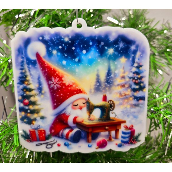 This charming ornament features a small winter gnome hard at work sewing on a vintage sewing machine. The gnome, with its rosy cheeks and long white beard, is dressed in a cozy red and green outfit, complete with a pointed hat that adds a festive touch. Perched on a tiny stool, the gnome carefully guides a piece of fabric through the sewing machine, its tiny hands skillfully working the machine’s crank. The sewing machine itself is a beautifully detailed miniature, painted in a rustic black with delicate golden accents, evoking a sense of nostalgia. Surrounding the gnome are small spools of colorful thread, fabric scraps, and a pincushion, creating a lively and industrious scene. The snowy backdrop outside the gnome’s little workshop adds a serene winter ambiance, with snowflakes gently falling and snow-covered trees visible through a frosted window. This ornament is perfect for adding a touch of crafty charm and festive warmth to your holiday décor, celebrating the joy of handmade creations during the winter season.