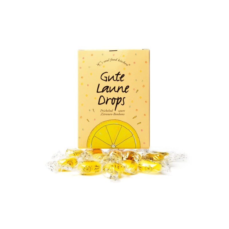 Good mood drops: A sunny thought can give a mismatched day a completely different face at any time. Change the direction of thinking, switch your antennas to reception for the little pleasures of life, enjoy the details. How about an imaginative, little daydream, for example for the duration of a candy suck length... while the grey cells are refreshed and invigorated by bright lemon aroma, accompanied by a cheeky tingling that tickles the palate very close to thinking. Suck the good mood: first sour, then cheerful, then it is easier to continue. Nutritional information: serving size ‎100 grams, energy (kcal) ‎391.72 kcal, fat ‎0.1 grams of which: - saturated fatty acids ‎0.1 g carbohydrates ‎94 grams of which: - sugar ‎74 grams protein ‎0.01 g salt ‎0.5 grams. INGREDIENTS: sugar, glucose syrup, acidifier: citric acid, dextrose, acidity regulator: sodium bicarbonate, vitamin C, flavouring, colouring food: curcuma extract. ---Manufacturer/distributor: World of Soulfood c/o SPN Customize GmbH, 31848 Bad Münder