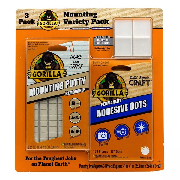 The Gorilla Mounting Variety Pack gives you three of our Gorilla Tough mounting adhesive options in one convenient package. These are great solutions for your home office, DIY and craft projects, school projects and much more. Gorilla Tough & Clear Double-Sided Square Mounting Tape is a clear double-sided tape that mounts in a snap, for a durable, weather-resistant bond. The clear adhesive tape will not yellow over time. This mounting tape holds 1 pound per 4 squares of tape. Gorilla Tough & Clear mounting tape is perfect for indoor and outdoor projects and adheres to smooth and rough surfaces. Gorilla Mounting Putty is ideal for hanging lightweight items in place of traditional tapes, push pins and fasteners. The squares are non-toxic, repositionable and durable. Ideal for temporary indoor and outdoor use. Use on paper, painted walls, wood, tile, metal, signs, plastic, glass and more. Gorilla Permanent Adhesive Dots are clear with adhesive on both sides, making them ideal for card making, scrapbooking, attaching photos and embellishments. These no-mess dots are a permanent alternative to glue and are photo-safe and acid-free. Ideal for home, school and office. Use on photos, paper, wood, metal, foam, glass, plastic, painted walls and more.