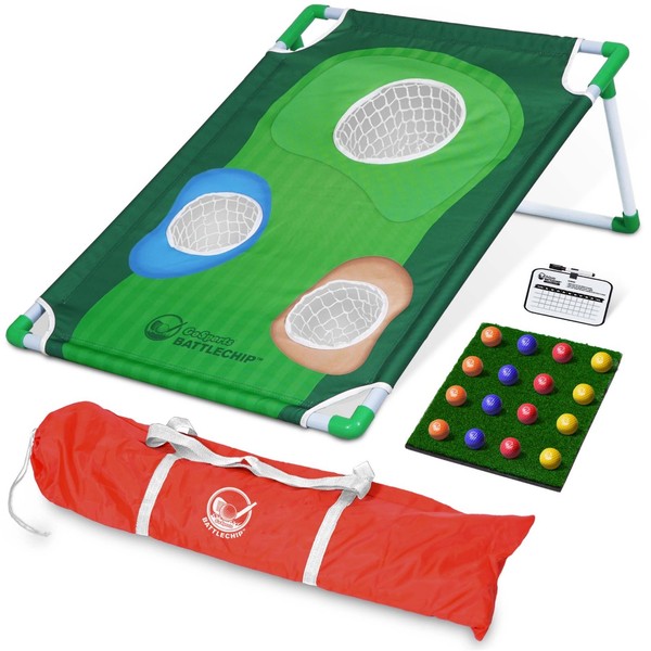 - BATTLECHIP: An exciting new hybrid between golf and cornhole for the ultimate outdoor game! Easy to learn and fun for all skills levels – includes 3’x2’ target, hitting mat, 16 color foam balls and carry case