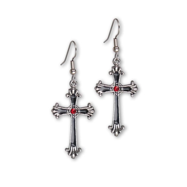 Gothic Victorian Cross Dangle Earrings with Red Austrian Crystals