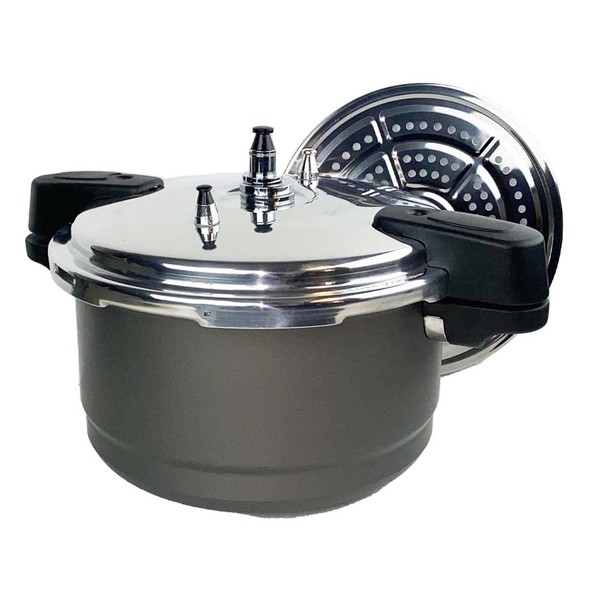 - Hard anodized finish so it can be used as a pressure cooker or steamer