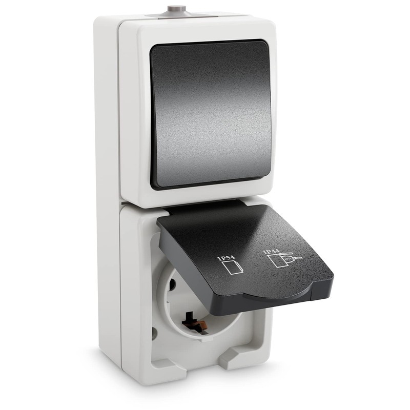 - Box contents: 1 x switch socket surface-mounted wet room / surface-mounted Schuko socket IP44 16 A / surface-mounted toggle switch IP54 10 A / 2 cable entries / grey / operating voltage 250 V AC