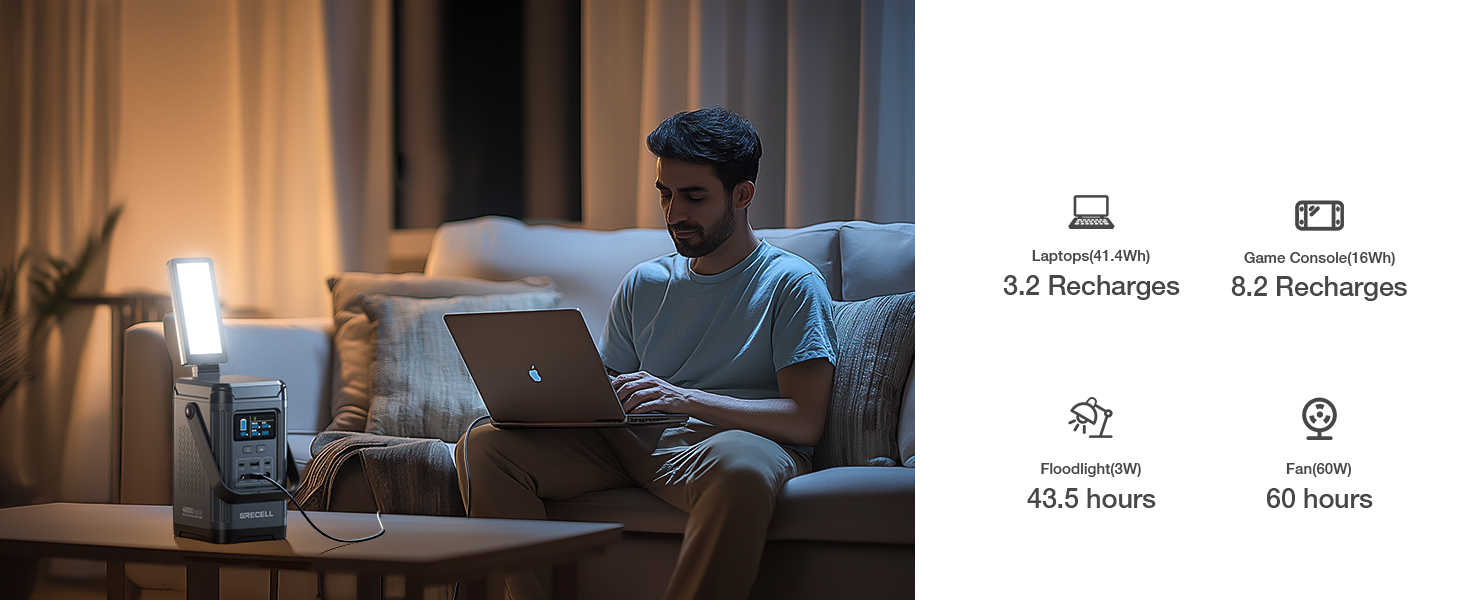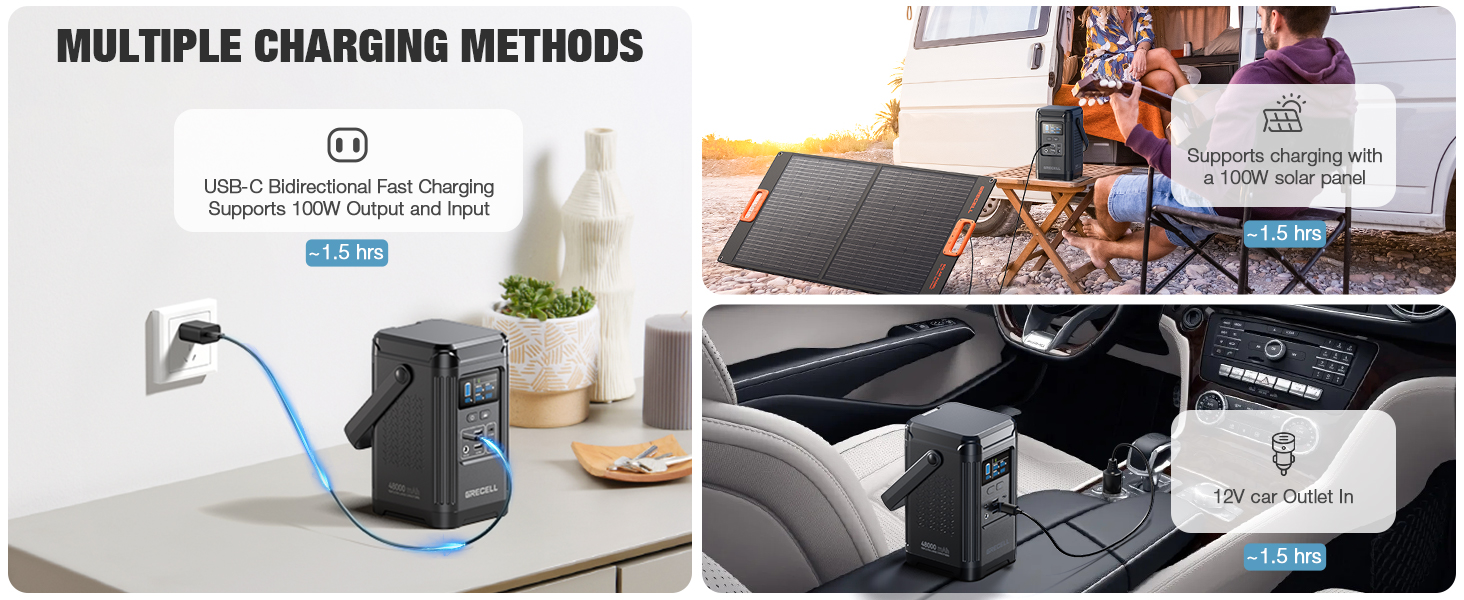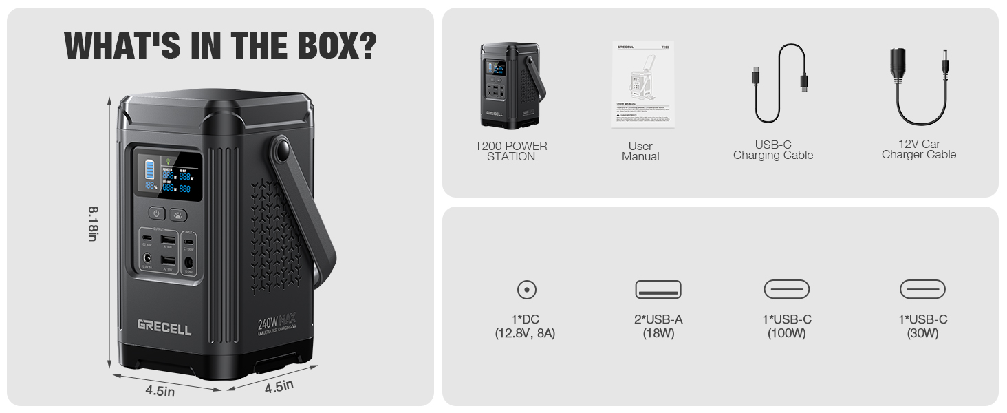 [FAST CHARGING] GRECELL 240W portable power supply with 153.6Wh/12800mAh capacity, equipped with 5 output ports and 2 input options, supports charging multiple devices. Providing Type-C 100W fast charging to meet various outdoor and emergency power needs.