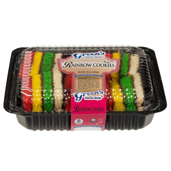 Green's rainbow cookies are made from all natural ingredients, in a nut-free and dairy-free kitchen, and are certified kosher pareve.