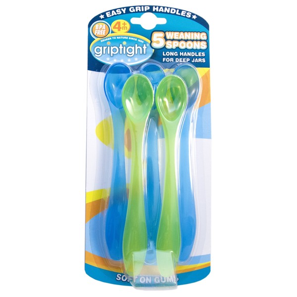 Griptight - 5 Long Handle Soft Weaning Spoons (Blue and Green)