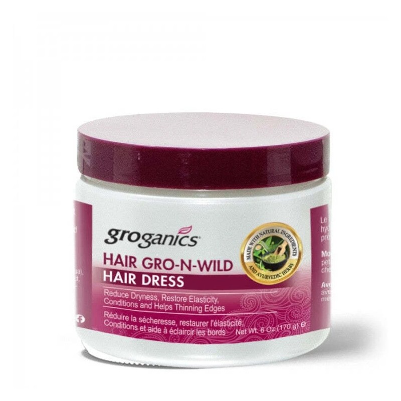Groganics® Hair Gro N Wild Hair Dress helps seal moisture in hair for elasticity, strength, and protection from environmental stressors.  Formulated with powerful Pea Sprout Protein and Ayurvedic Herb Eclipta Alba.