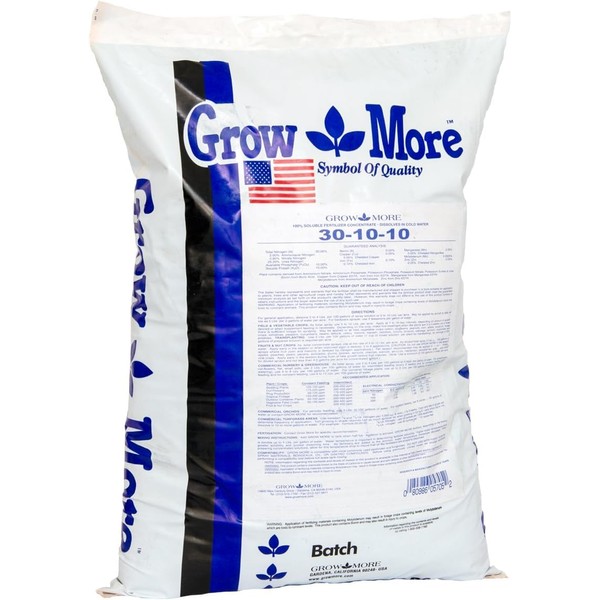 Grow More Fertilizers are formulated to supply sufficient amounts of extra nutrients for high yields. High solubility, purity and the special forms of nitrogen, phosphorus and potassium make Grow More Fertilizers the ideal product. A high nitrogen formula for spring and early summer applications, it provides an early nitrogen boost for fast, healthy plant growth.