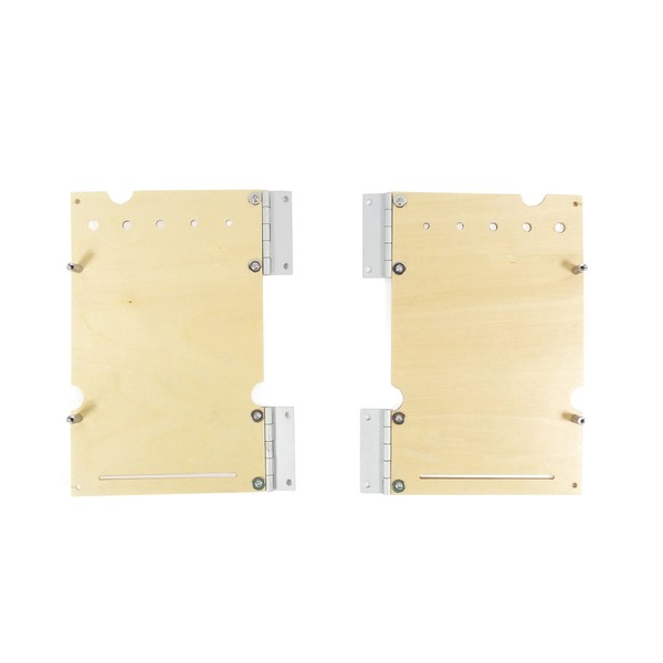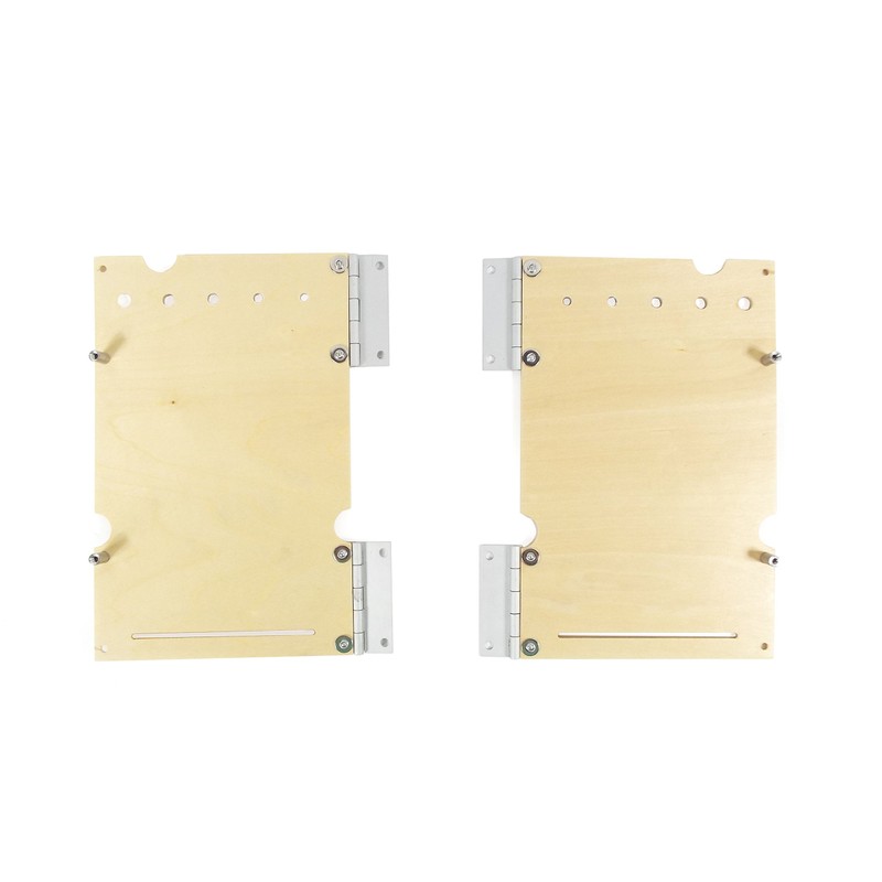 Right and left hinged palette extensions double your working space for the 9 by 12 Guerrilla Box. Includes parking slots for the Hang-Up Brush Caddy and holes for brushes. Aluminum "standoffs" keep it from touching the Guerrilla Box sliding palette when closed (Note: remove the "standoffs" when used in conjunction with the Backpacker Watercolor Palette or Covered Palette Tray). Easily attaches using existing pilot holes. (NOTE: With the Palette Extension Kit installed, you will be able to carry one fewer wet panels in the Guerrilla Box lid.) Mounting screws included. Basswood laminate with aluminum hinges.