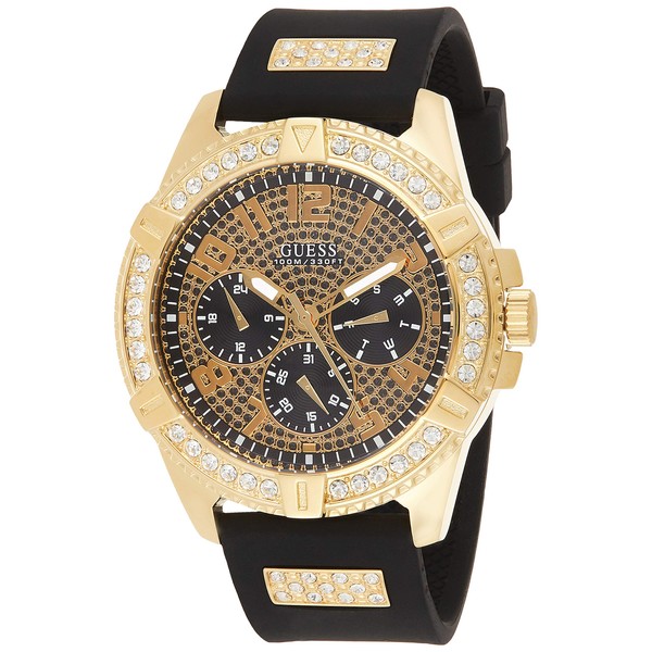 This watch Guess W1132G1 is oriented for men, has the case made of steel, with round shape and of black and gold colour. The bracelet is made of black silicone, and the bezel is gold plated with white crystal pavé. The glass is made of mineral glass, the movement is a quartz movement, and the display is analogue. It belongs to the Frontier collection. It can be submerged up to 100 m under water. Its functions include: Multifunction. Diameter: 48 mm.