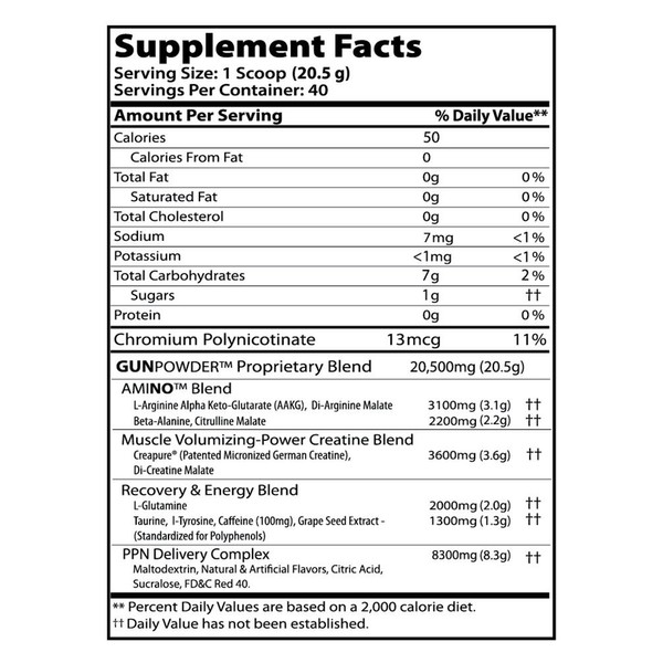 PPN's GunPOWDER is the most powerful and comprehensive Nitric Oxide enhancing product available. It is a combination of the best Nitric Oxide enhancer's, Creatine, Glutamine and Beta Alanine. By combining all of these premium ingredients together, in FULL DOSAGES you have everything you need in one product. Eliminating the need to purchase four separate products making it more effective, convenient and less expensive!