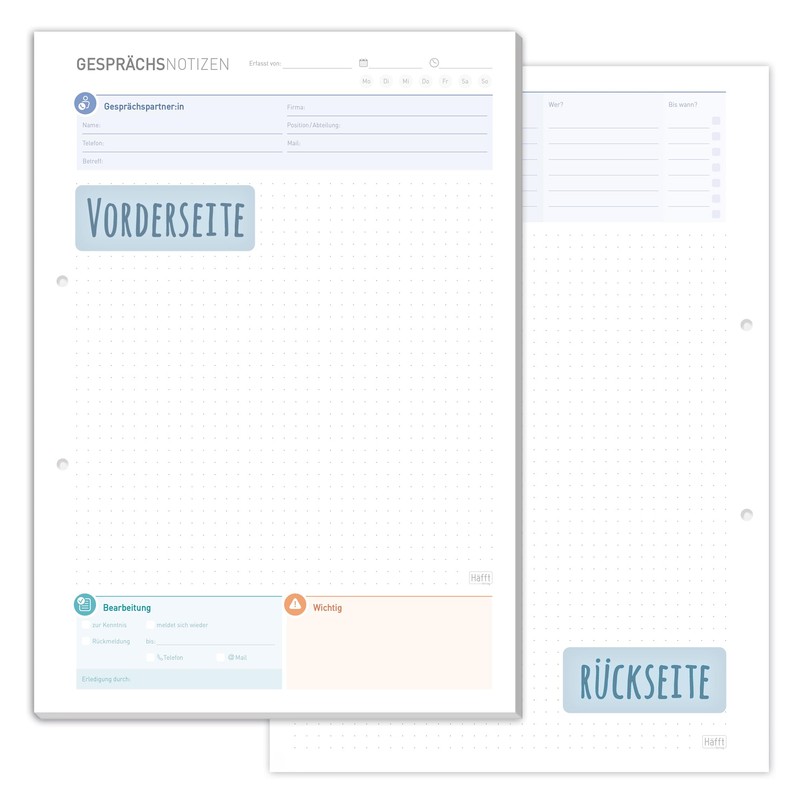 In the middle there is a generous note field for conversation content, open questions, thoughts, information and much more. For many other conversation notes, simply write on the back, which is also held in the flexible dotted ruling. The side perforation of the pad makes quick filing in project folders etc. comfortable. Recording conversation content while making calls makes a big difference and makes everyday work a lot easier.