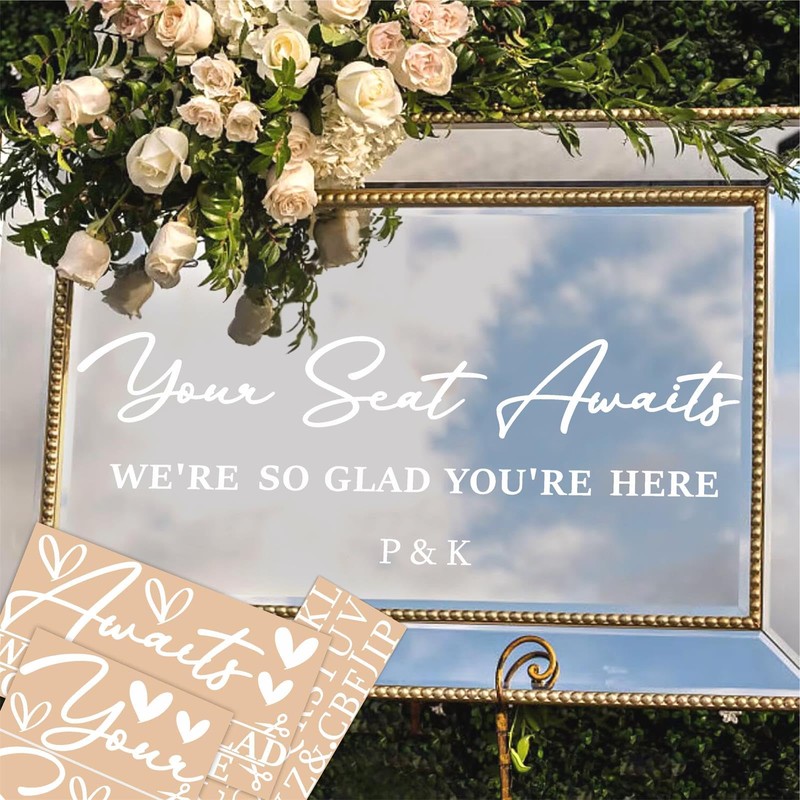 • What You Will Get: Total 3 sheets,size are 7.8*7.8 inches,5.9* 11 inches and 3.5*11 inches of Selfie Mirror Wedding Party Decals,"Your Seat Awaits" display size: 3.8*23.8 inches(you can adjust by yourself)