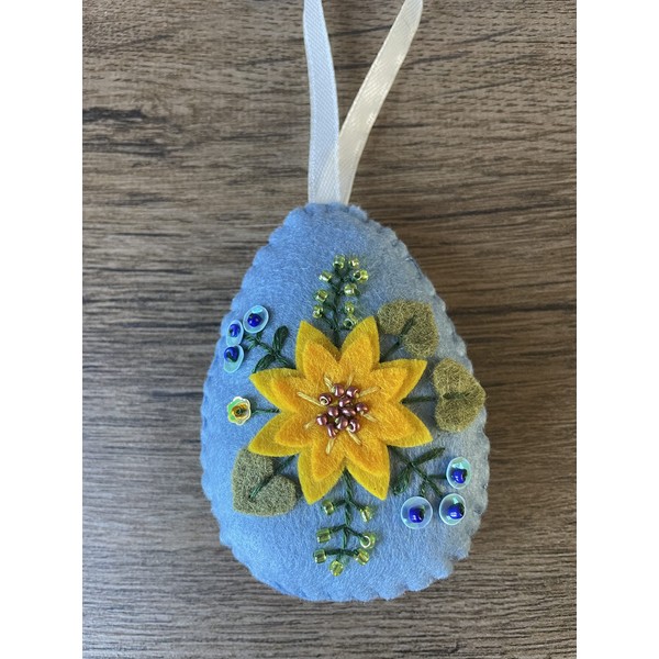 Handmade Felt Easter Decorations Blue Easter egg with yellow flower It is made with quality felt, ribbon, beads and lightly stuffed. All hand stitched and no glue used. #Great as a home decoration or a gift. It is not a toy. Egg 5cm x 7cm Take a look at my other items. I am selling a lot of handmade decorations.