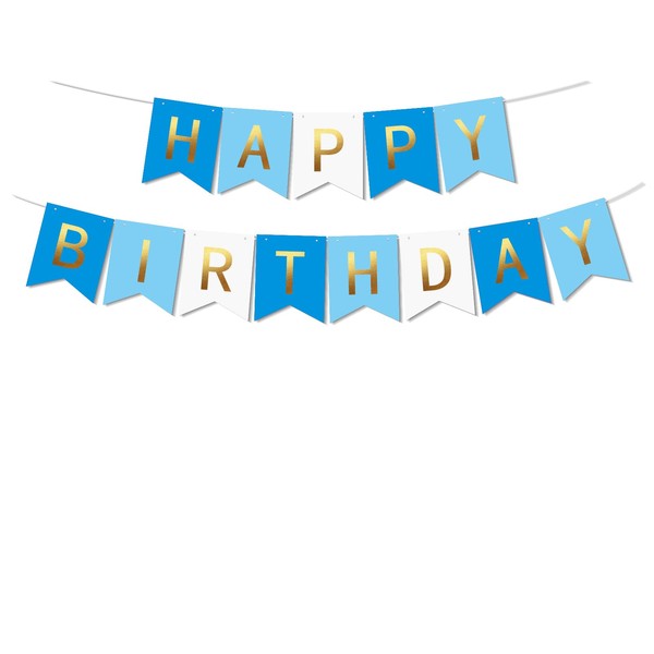 - Happy Birthday banner - in deep blue, light blue and white with gold foil