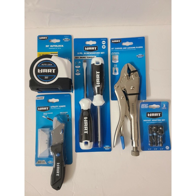 Hart Tool Bundle, 10" Pliers,2pc Screwdriver,30 Feet Autolock Tape,Knife,Adapter.
