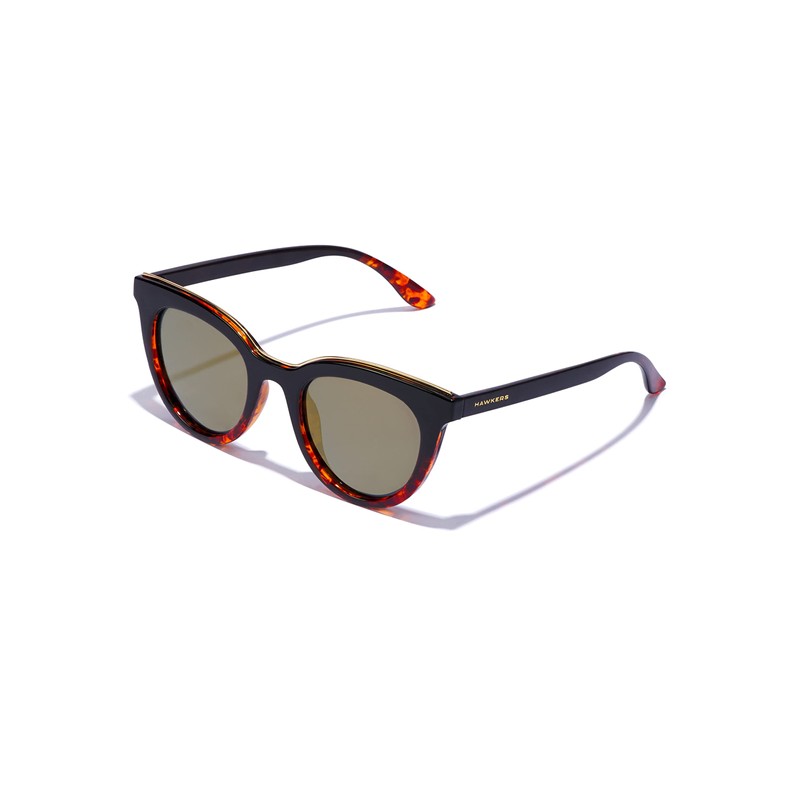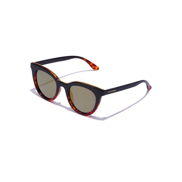 - The polished black upper rings and temples of this rounded cat eye model blend with the lower rings, tortoiseshell finials, and are complemented by gold-tone metal accents along the brow line and polarized gold lenses.