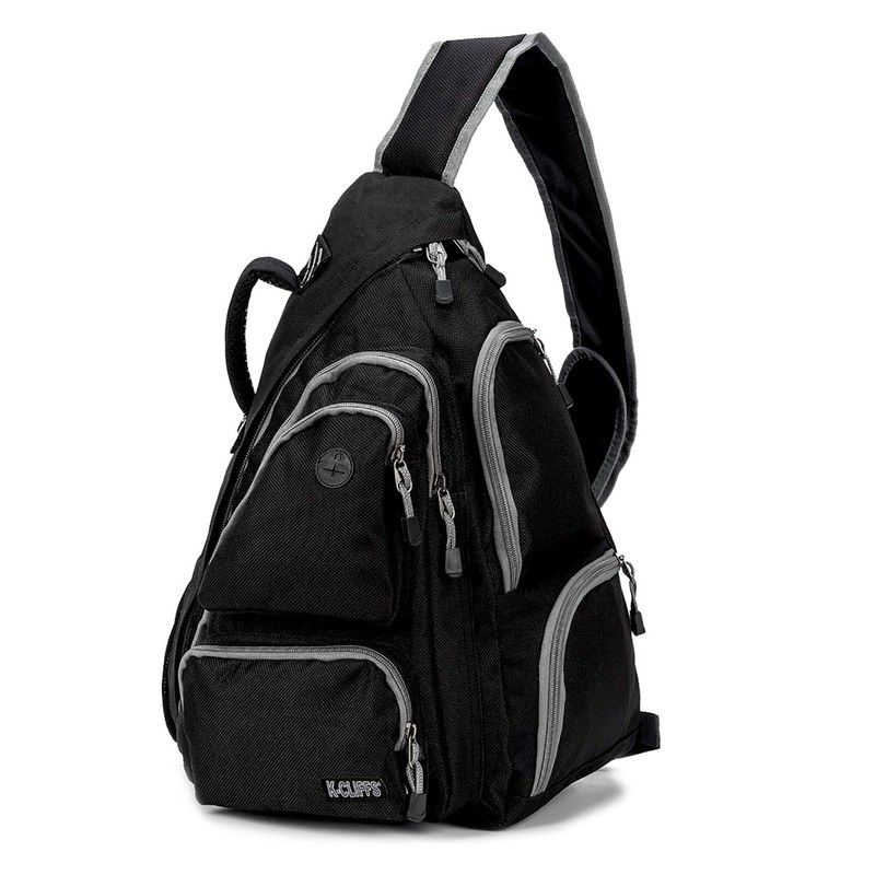 - Sling Backpack with Multiple front pockets and side pockets for storage.
