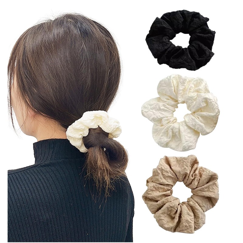 - ♠【きれいめもカジュアルも叶える優秀アイテム】サテン風のエンボス生地がおしゃれなシュシュの3個セット。さまざまなシーンで活躍する大人可愛いデザインのヘアアクセサリーです。