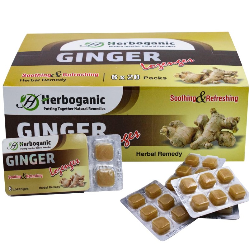HERBOGANIC Ginger Lozenges Leaf of 6, 20 Packs per Box 120 lozenges