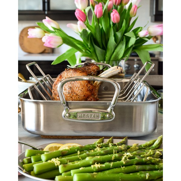 - SUPERIOR CLAD CONSTRUCTION - Hestan Provisions Classic Roaster boasts a tri-ply construction with an ultra conductive aluminum core is great for sauce reductions, deglazing, searing, and making gravy directly on the stove top
