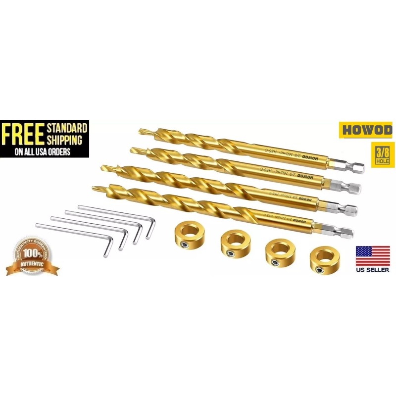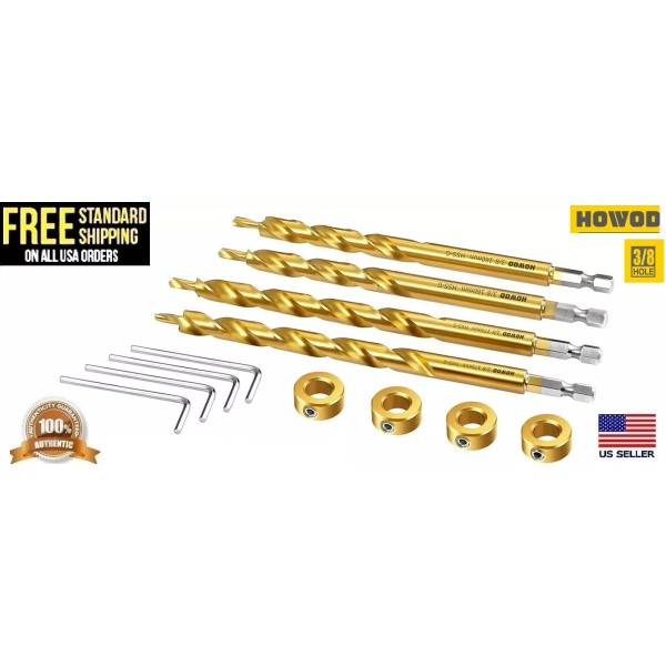 HOWOD 4 Piece HOWOD Pocket Hole Drill bit Professional Set 3/8” stepped drill Jig