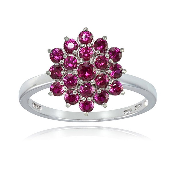- This sterling silver ring features a flower-shaped cluster of round created ruby gemstones.