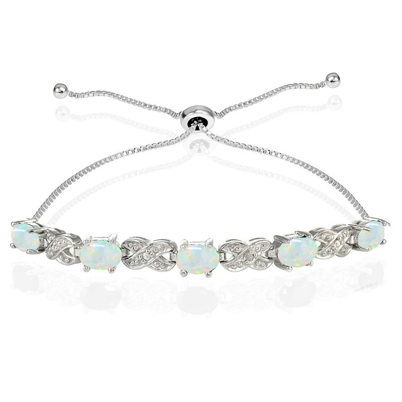 - Sterling Silver adjustable bolo bracelet features an elaborate design that focuses on the meaningful infinity symbol which is linked with created white opal gemstones.