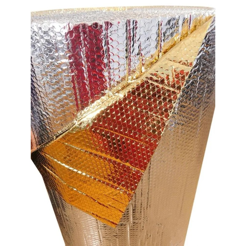 • Two layers of polyethylene industrialized air bubbles bonded between two layers of highly reflective metalized aluminum polyester film. One side is reflective metalized silver foil. The other side is also reflective foil coated with a Waterproof Fire Resistant Gold Metallic Finish.
