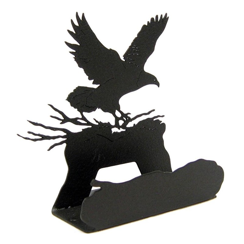Description: An eagle lands in its nest on top of this business card holder. Laser cut with excellent quality and precise detail. Size: 4-3/4" wide x 4-1/4" tall x 2-1/4" deep. Material:18 gauge steel. Finish: Black wrinkle powder coat.