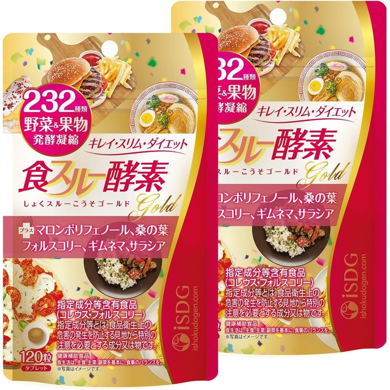 - 【主要成分】ISDG 食スルー酵素 Gold 232種類野菜&果物発酵凝縮 120粒/袋、2個。232の複合植物発酵粉末、マロンポリフェノール、桑の葉、コレウスフォルスコリ、ギムネマ・シルベスタ、サラシアと酵素・酵母&麹の組合せで、めぐりボディーに導いてくれます。
