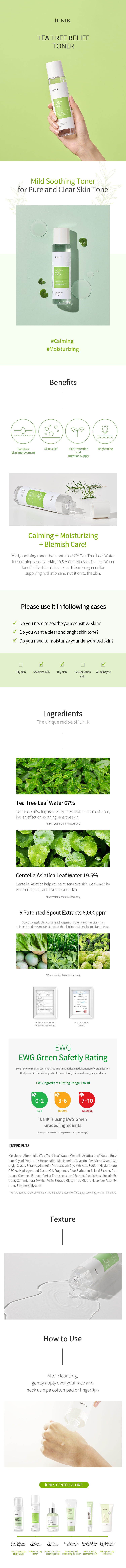 - Ingredients: Melaleuca Alternifolia (Tea Tree) Leaf Water (65%), Centella Asiatica Leaf Water (19.1%), Butylene Glycol, Water, 1,2-Hexanediol, Niacinamide, Glycerin, Betaine, Sodium Hyaluronate, Caprylyl Glycol, Portulaca Oleracea Extract, Allantoin, Ethylhexylglycerin, Dipotassium Glycyrrhizate, Aloe Barbadensis Leaf Extract, Pentylene Glycol, Aspalathus Linearis Extract, Glycyrrhiza Glabra (Licorice) Extract, Commiphora Myrrha Resin Extract, Perilla Frutescens Leaf Extract, PEG-60 Hydrogenated Castor Oil, Fragrance