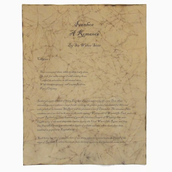 Ivanhoe can now be remembered and cherished with this antiqued copy of the first page of Walter Scott's classic tale. Whether framed on a wall or used as part of a centerpiece, this beautifully aged paper will be loved by any Ivanhoe or Walter Scott fan. Our four step aging process transforms regular paper into paper that looks hundreds of years old. It not only LOOKS antique, but it FEELS antique, as well!