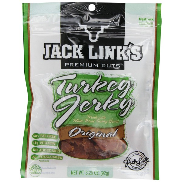 - Jack Link's Original Turkey Jerky. Premium cuts. Made with white meat turkey breast. 98% fat free. 13g protein. No added MSG. 5g total carbs. Family quality guarantee Jack Link. Since 1885. Fresh-Lock zipper. Resealable packaging. Inspected for wholesomeness by U.S. department of agriculture.