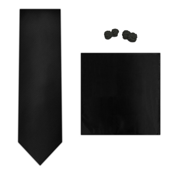 - 3 piece set: men's slim width self-tie, pocket square and knots in black solid color.