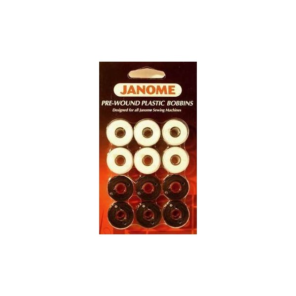 Janome 12 Pack Pre-Wound Plastic Bobbins White and Black Thread