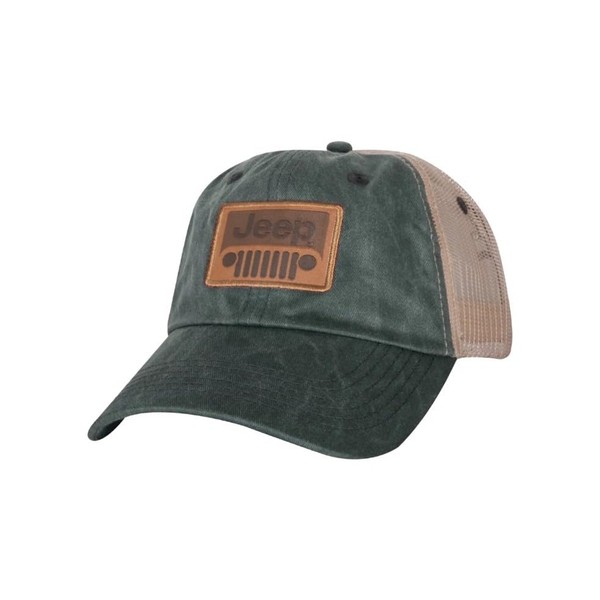 - Jeep word with grille on faux leather patch with debossed Jeep logo and grille