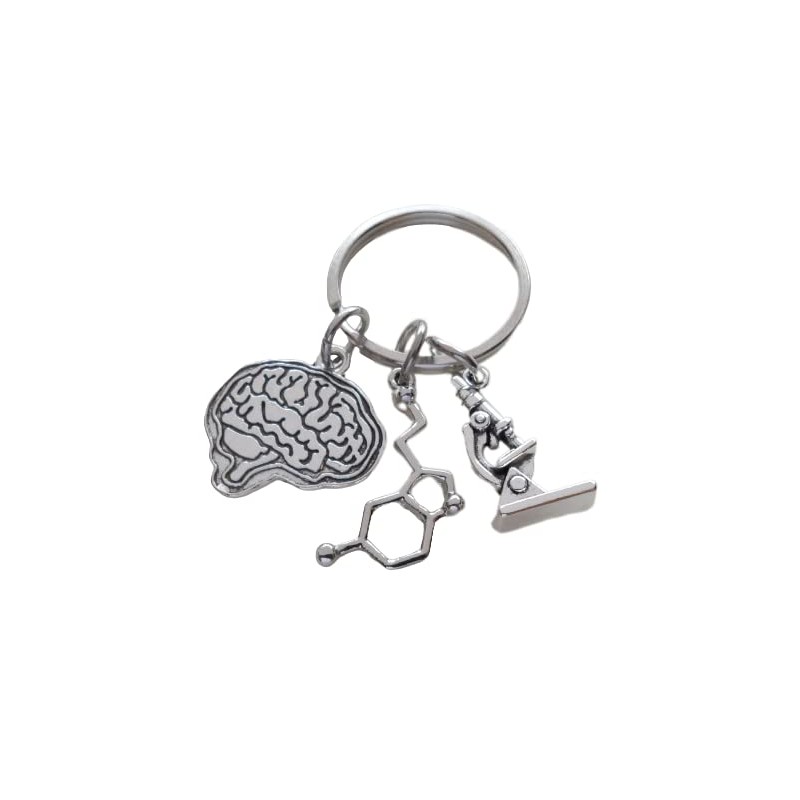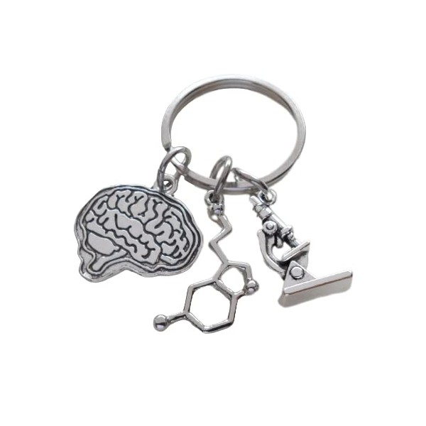 The keychain has a serotonin molecule charm, microscope charm, and brain charm. A charm keychain as a gift for a medical professional in mental health or psychology. Great gift for employees, staff, and educators to show your appreciation. The brain charm is about 1 inch across.