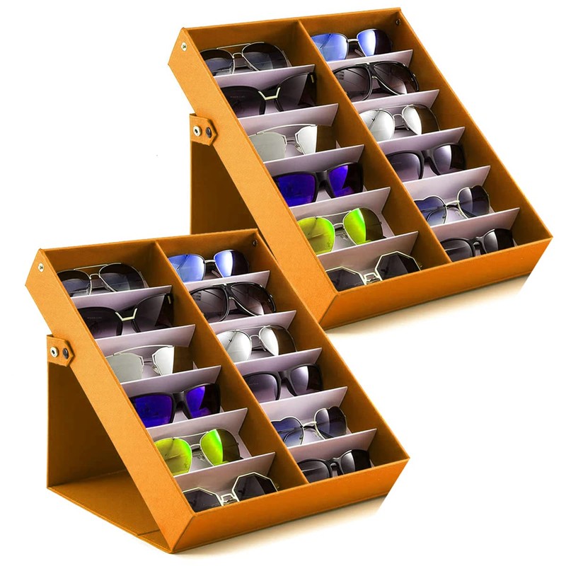 jiffordwind 12 Slot Polyester Silk Lining Sunglasses Display Case with Stand Function (Yellow 2pack)