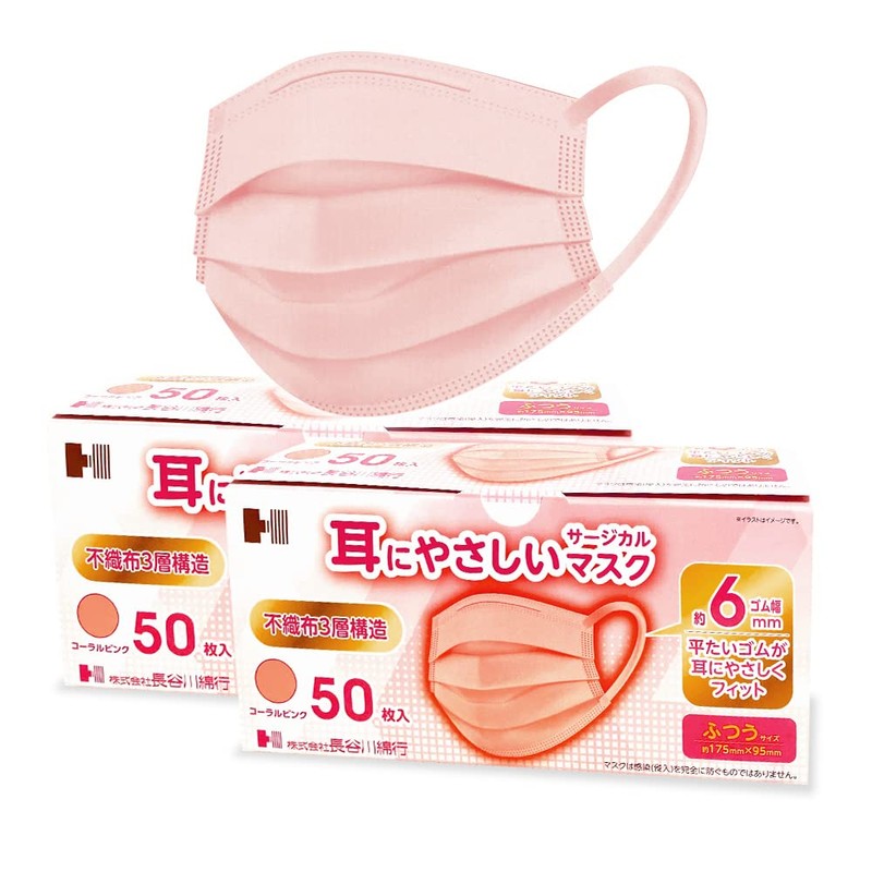 [長谷川綿行] JIS規格適合 耳にやさしいサージカル マスク 2箱 100枚 ピンク ひも6mm
