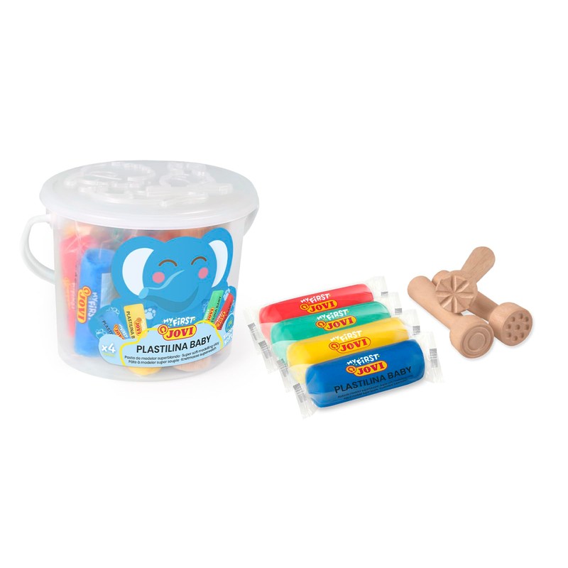 - Box contents: My first Jovi Baby Plastilina, 8 pack each 38 g in the colours yellow, blue, red, green (2 pack each), 3 wooden stamps (different patterns), practical storage box