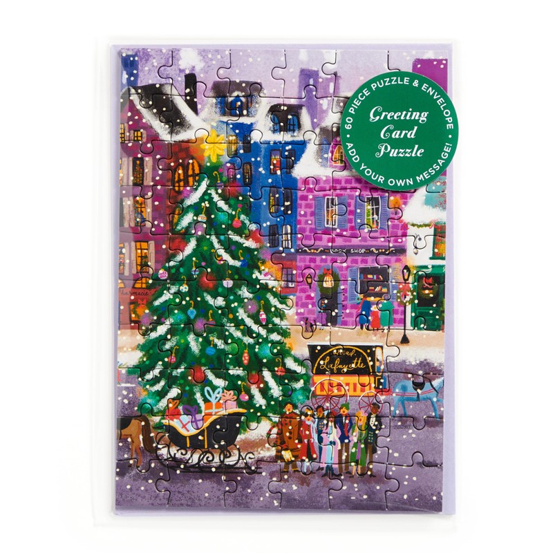 - BRIGHT AND BOLD ARTWORK – The greeting card design captures the charm of the holidays in a town square, lit up for Christmas. After writing a personal message on the back, one can then break up the puzzle and send the pieces to a friend, colleague or loved one to puzzle together and read