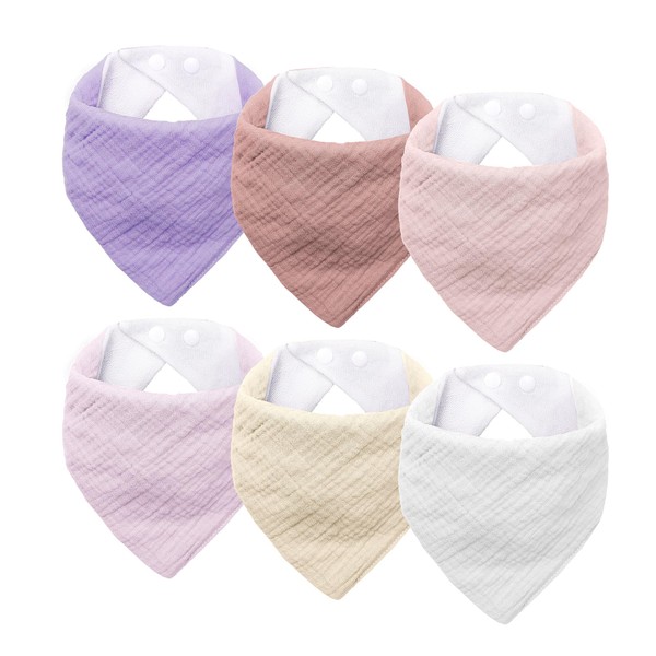 Soft & Absorbent Muslin Bib for Babies - Perfect protection against drool and spit. Ultra soft comfort for delicate baby skin: Our bib baby collection is made of high-quality muslin cloth baby, which is super soft and breathable. Whether as a drool bib, burp bib baby or stylish toddler scarf, our bibs protect sensitive skin from moisture and friction. Thanks to the lightweight material, they are ideal for hot days or for sleeping. Practical design for any occasion: the baby muslin triangular scarf is versatile: as a drool cloth baby when feeding, as a baby bib for on the go or as a fashionable accessory. The washable baby bibs are particularly practical for parents - simply machine wash and use again and again. Perfect as a bib toddler or children's bib for boys and girls. Perfect gift for baby shower: Are you looking for a creative gift? Our baby shower bibs are a highlight! The set contains different colours, including subtle tones for baby boy bibs and cute pastel colours for baby girl's bandanas. Packed in a pretty box, they are ideal as a souvenir for a birth or christening. Adjustable and durable: with practical press studs, the baby bib adapts to any neck size - from newborns to active toddlers. The durable muslin baby bib dries quickly and remains dimensionally stable even after frequent washing. ✔ Set of 6 in trendy colours ✔ Absorbent & quick drying ✔ Machine washable up to 30 °C ✔ Perfect for teething phase and feeding. Discover the perfect baby bib for your little one now - order today and always keep your child dry and stylish!