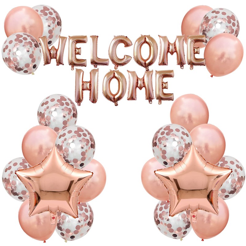 - パッケージ内容: Welcome Homeの文字入りバルーン1個、星型のホイルバルーン2個、2つのスタイルのラテックスバルーン20個(ローズゴールド、ローズゴールドの紙吹雪スパンコール)、ローズゴールドのリボン1個、合計24パック。