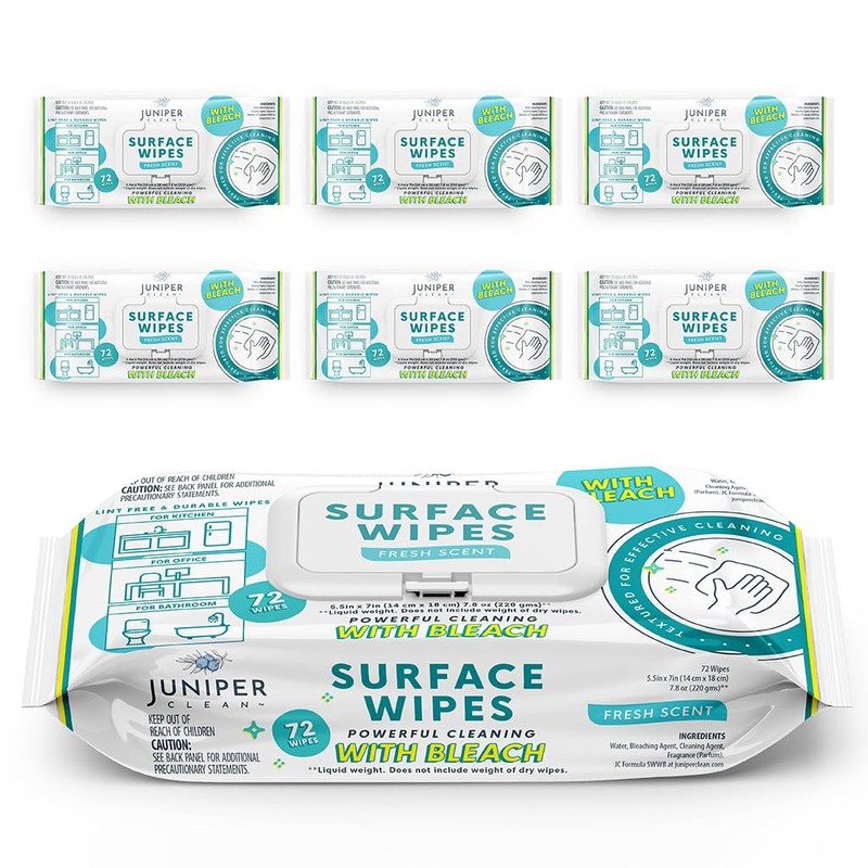 Juniper CLEAN 6 Pack Surface Cleaning Wipes with Bleach, All-Purpose Cleaner for Bathroom, Kitchen, Office, 72 Count Soft Flow, Fresh Scent, Lint Free & Durable