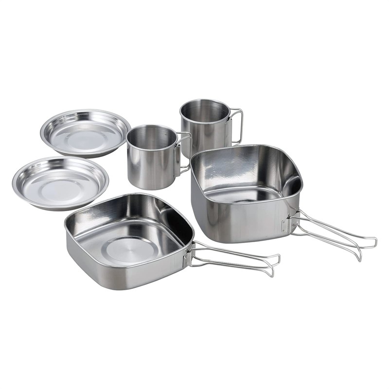 - Material: Lid For Square Pots and Frying Pans: Stainless steel; Bottom Thickness: 0.2 inches (0.4 mm); Mug: Stainless steel (13% chromium); Bottom Thickness: 0.01 inches (0.35 mm); Capacity: 9.1 fl oz (270 ml); Small Plate: Stainless steel; Bottom Thickness: 0.01 inches (0.3 mm); Portable Bag: Non-woven fabric