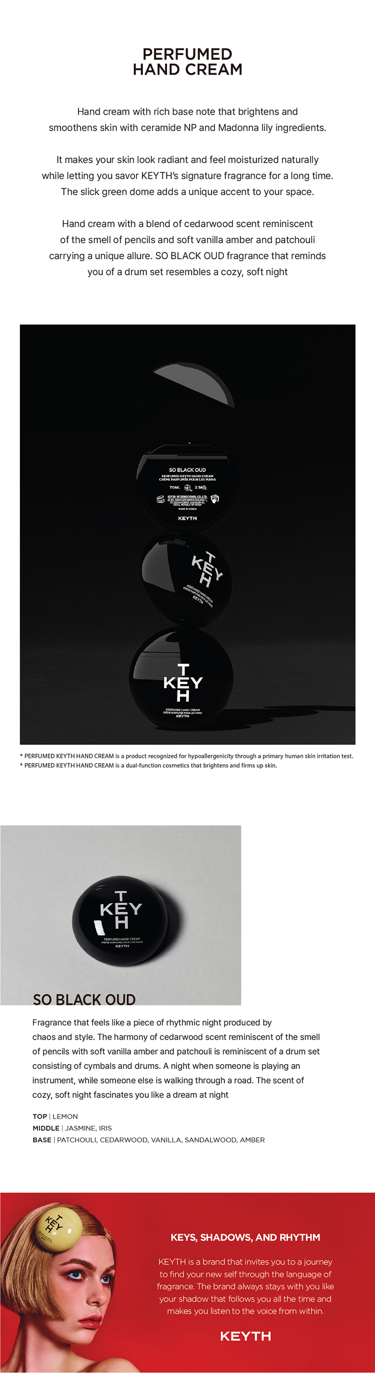 Provides seamless glow and moisture while enjoying KEYTH's signature scent for a long time. The warm, heavy vanilla and musk scent wraps around warmly. A scent like a rhythmic piece of the night created by chaos and sophistication. The cedarwood scent reminiscent of a pencil and the harmony of soft vanilla amber and patchouli evoke a drum set created by cymbals and drums. It is a low-irritant product that has passed a skin primary irritation test. A product that meets the Clean at Sephora harmful ingredient standards. Dual functional product for skin brightening and anti-wrinkle. Inspired by a journey of exploring materials to create a single fragrance, as if opening doors one by one with a key.