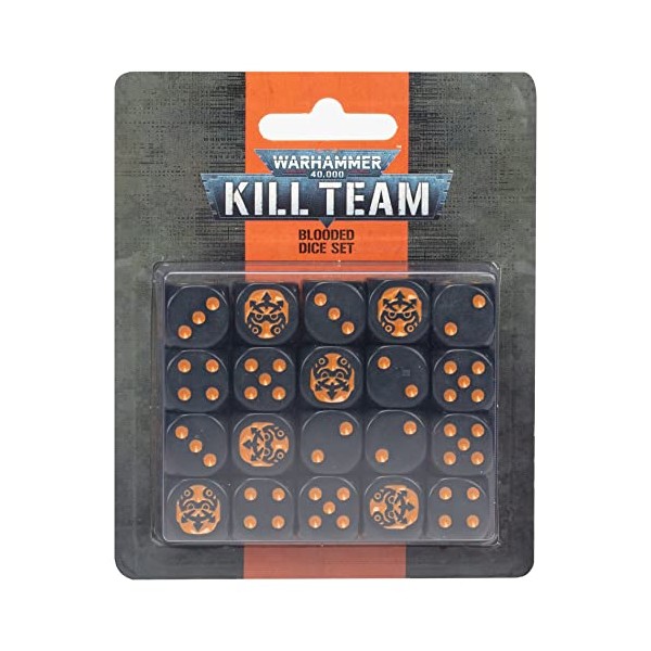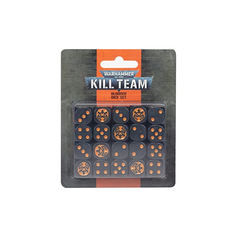 Court the favour of the Dark Gods with these Blooded dice 20 black dice with orange pips Each dice features a Blooded trooper helmet design on the 6 face