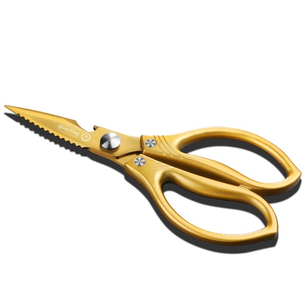 - STYLISH GOLD KITCHEN SCISSORS: Lightweight with style: lightweight aluminium alloy handles in vibrant gold tone, combined with titanium coated blades for superior edge retention and rust protection - all in an elegant gold look. This all-over gold design will be the focal point in your kitchen.