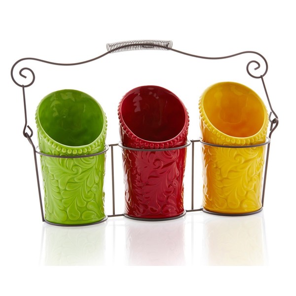 **Looking for a kitchen countertop décor without losing its functionality?** iEnjoyware’s multi-color utensil crock holder set is here for you. This 3-piece ceramic utensil holders with wire caddy will keep your cooking utensils neatly organized and all in one place. Or you can use them separately. One can be used for storing cooking utensils nearby the stove-top while others can be placed next to the sink. This utensil holders Set is also great for the party. The wire caddy allows you easily carry organized flatware/silverware to anywhere you want. Our utensil holder caddy set is also a great gift idea for Mom, Grandma or Wife. They will surely fall in love with this beautiful yet functional utensil organizer!